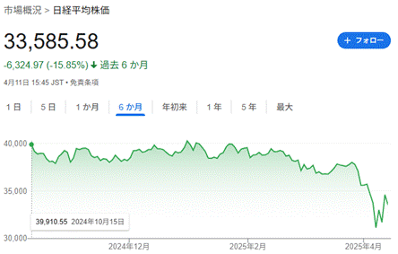 - そして言うまでもなく、このコロコロと変わる発言と、信頼性の薄いバックデータに振り回されて高いボラティリティを記録しているのが金融市場だ。下はすべて六ヶ月での米国ダウジョーンズ、日経225平均、円ドルレートのグラフだが、相当な変動だ。日経新聞の4/9の記事によれば、トランプ関税の騒ぎで世界の株式時価は1割(=12兆ドル、1,800兆円)消失したそうだ。世界中の投資家もそうだが、「貯蓄から投資へ」がやっと浸透し始めた日本の当局は気が気ではないだろう。