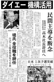 - しかし、「拡大速度の速さと規模」、「オーナー経営による社内外での阻害された意思疎通」、「経済情勢変化(平成バブル崩壊)による財務・資金環境の悪化」などから1990年代後半以降、経営状況は厳しさを増し、不良債権の回収に軸足を切った省庁と銀行により「産業再生機構」という不良債権処理専門の組織に入るように強いられ、その結果、黒字店舗は売却され、赤字店舗は他社に譲渡されたり不良資産として処理されたりした。ちなみにダイエーは債務不履行を一切していないので、不良債権に分類されるものは持っていないのだが、「不良債権の可能性」があるということで不運な運命を辿ることになった。筆者個人の私見としては、平成バブル崩壊の解決を図るうえで民間企業を犠牲にせざるを得なかった「黒歴史」だと考えている。