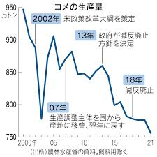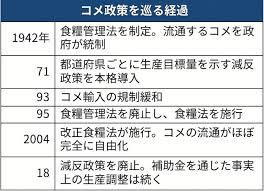 - 事実、食糧管理法は1995年に廃止されることでコメの国による買い入れ制度は廃止され、「価格維持よりも備蓄」に舵がとられ、コメの価格は市場取引で形成されるようになる。そして、「減反政策」は2018年度に廃止となり、補助金の支給は完全に打ち切られた。水田を潰し、他の作物生産に転換した農家はそれら作物による収入に依存するしかなくなった。一方で、コメの生産量は激減することで天候などによる供給不足が1985年や1994年(いわゆる「タイ米輸入騒動」)に起こった。そして今、令和の米騒動は単にコメの値上がりを招いただけでなく、食糧安全保障を脅かしている。