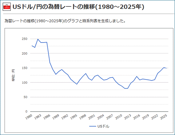 - 今更言うまでも無く「失われた30年」で失ったものは、端的に言えば、あの強かった日本の国力に他ならない。国力を測る指標はGDP、購買力平価、外貨準備高、政府債務、労働生産性、労働人口、為替レートなど数々ある。どれもが重要な指標だが、輸出国であり、また1985年のプラザ合意で強引に円高に誘導させられた日本がその後、「過剰流動性-平成バブル-バブル崩壊-不良債権処理-銀行の護送船団方式の崩壊-立ち直らない日本経済への信認の低下」と進んだことを考えると、円/ドルレートの動きは重要な国力指標といえるだろう。上記の流れに為替レートを加えるとこうなる。「プラザ合意1985年238円―過剰流動性1986年168円-平成バブル1988年128円-バブル崩壊1992年126円-不良債権処理1995年94円-銀行の護送船団方式の崩壊1999年113円-立ち直らない日本経済への信認の低下2001年121円」。もちろん2000-2002年のITバブル崩壊や2004年のエンロン事件といった世界的な大きな出来事で一時的に為替は円安に振れるのだけど、2008年のリーマン・ショック以降は「相対的に安全な日本円」という消極的な考えから2011-2012年の79円台への円高はピークを迎える。しかし、同時にこれはあくまでも「相対的・消極的」な円高であり、その後一気に日本円は日本円への信認低下やコロナ禍、インフレーションを経て、100円台から2025年の155円台までを駆け上がる。