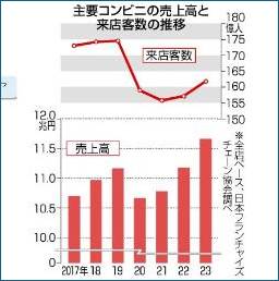 - 地方におけるコンビニ市場の侵食: 前々号であるコンビニエンスストア加盟店収益が低迷し、しかし、それに対してどういう対応を取るか明確に述べなかった決算発表について触れた。それの証左なのか、小商圏におけるコンビニエンスストア業態の勢いの低下についてのコメントが目だった。ある24時間営業を特色とする食品スーパーは、足下の経営数値から「コンビニの上位売れ筋商品が自社で買われるようになった」と述べた。また、「近い」という利便性を無視し、食品スーパーやディスカウントストアなどの「低価格」「豊富な品揃え」を消費者が選択するようになったと述べた。特に移動手段として自動車が必需品である地方ではその傾向が強い。それはコロナ禍を過ぎても回復しない客数の低迷が象徴的だ。